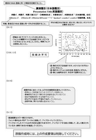 - ・講演申込と同時にPDFファイルをアップロードして、講演概要を提出して下さい。(※同時に行わない場合は、講演申込は受理されません)