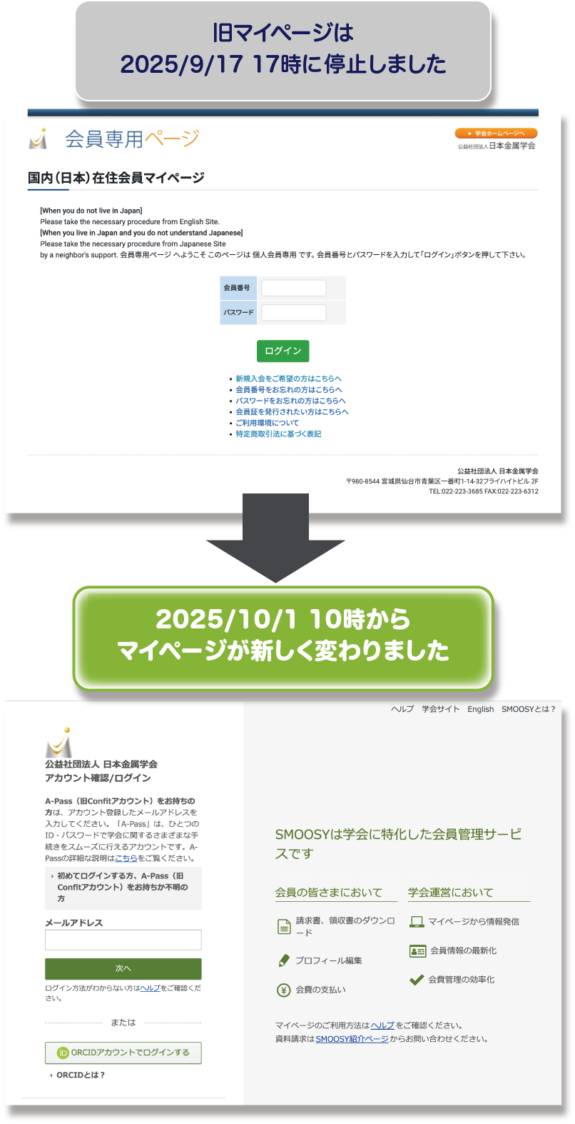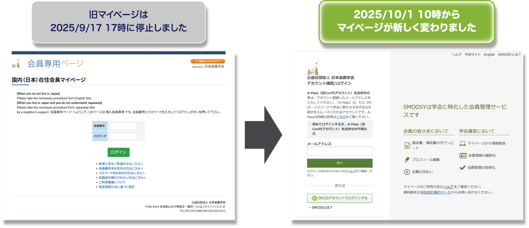 SMOOSYへの移行方法につきましては、会誌『まてりあ』2025年10月号の会告にてご案内申し上げるとともに、2025年9月29日に会員の皆様へメールにてお知らせいたします。